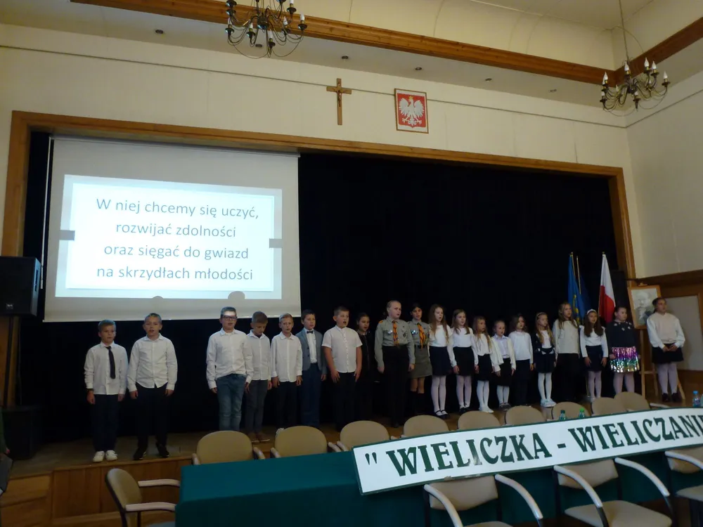 Uczniowie pod kierunkiem Pauliny Karcz wykonali hymn szkoły, wzbogacając uroczystość artystycznym akcentem.
