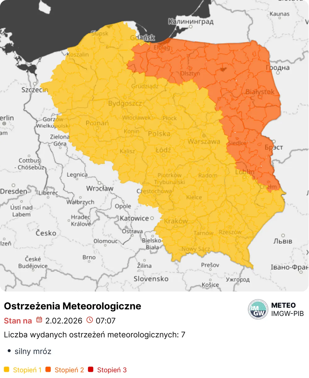 Najważniejszy pozostanie jednak mróz: IMGW wydało dla całej Małopolski ostrzeżenie pierwszego stopnia przed silnym mrozem (prawdopodobieństwo 80%) obowiązujące od 31 stycznia, godz. 22:00 do 3 lutego, godz. 10:00. Według komunikatu, w nocy temperatury mogą spadać miejscami do -18°C, a w dzień maksima mają utrzymywać się w przedziale od -13°C do -9°C, przy wietrze 10–25 km/h.