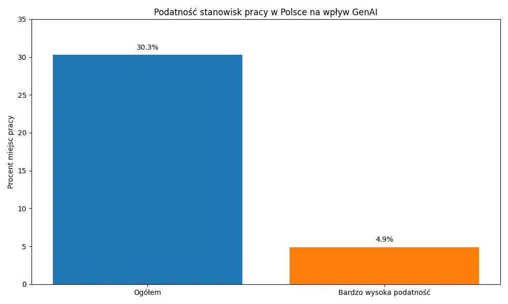 Badania przeprowadzone przez NASK w czerwcu 2025 roku wskazują, że 30,3% wszystkich miejsc pracy w Polsce, co odpowiada około 5,08 milionom stanowisk, jest podatnych na pewien stopień interakcji z GenAI. Nie oznacza to jednak, że wszystkie te miejsca pracy znikną. Podatność odnosi się do możliwości automatyzacji lub przekształcenia istniejących zadań, co może prowadzić do pojawienia się nowych ról i innowacji. Wśród tych stanowisk, około 817,5 tysiąca (4,9% ogólnego zatrudnienia) charakteryzuje się bardzo wysoką podatnością na automatyzację. Są to zawody, w których zadania mogą zostać najszybciej zautomatyzowane lub znacząco zmienione.