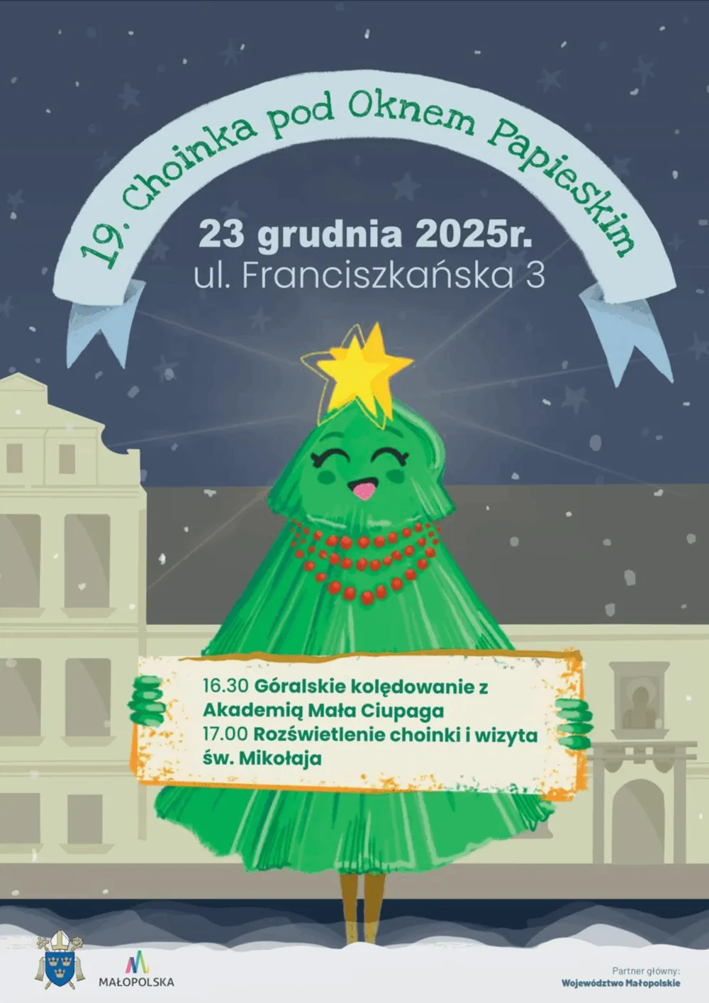 Po miejskim rozświetleniu choinki na Rynku Głównym – z koncertami i nawet próbą pobicia rekordu we wspólnym śpiewaniu – w Krakowie przychodzi czas na wydarzenie bardziej „rodzinne”, ale równie wyczekiwane. We wtorek, 23 grudnia, pod Oknem Papieskim przy ul. Franciszkańskiej 3 po raz 19. zapłoną światełka na choince. Organizatorzy zapraszają szczególnie rodziny z dziećmi oraz grupy parafialne: to jedna z tych przedświątecznych tradycji, na której po prostu czuć, że Wigilia jest już za chwilę.