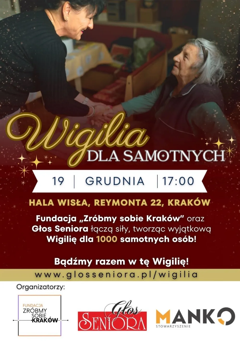 Wydarzenie odbędzie się 19 grudnia w Hali Wisły przy ul. Reymonta 22 w Krakowie. Skierowane jest do osób starszych, samotnych oraz wszystkich, którzy w tym wyjątkowym czasie potrzebują wsparcia i obecności drugiego człowieka. Organizatorzy podkreślają, że celem inicjatywy jest przeciwdziałanie samotności, budowanie relacji i wspólne przeżywanie świąt w atmosferze życzliwości i bliskości.