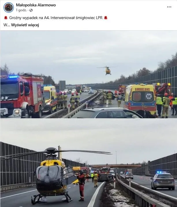 Na autostradzie A4 na wysokości Biadolin Radłowskich (gmina Wojnicz, powiat tarnowski) zderzyły się dwa samochody osobowe. W jednym z nich podróżowały cztery osoby, w tym dwoje dzieci. Policja informuje, że kierująca drugim autem doznała poważnych obrażeń i została przetransportowana do szpitala śmigłowcem LPR, a jedno z dzieci z drugiego pojazdu trafiło do placówki medycznej z obrażeniami kończyny górnej.