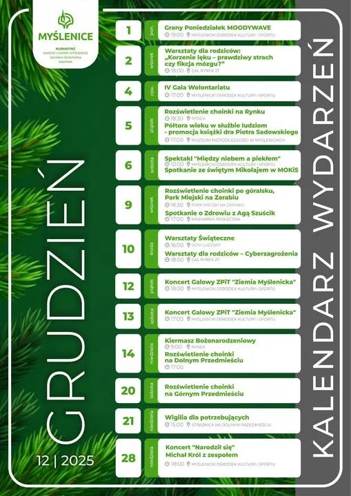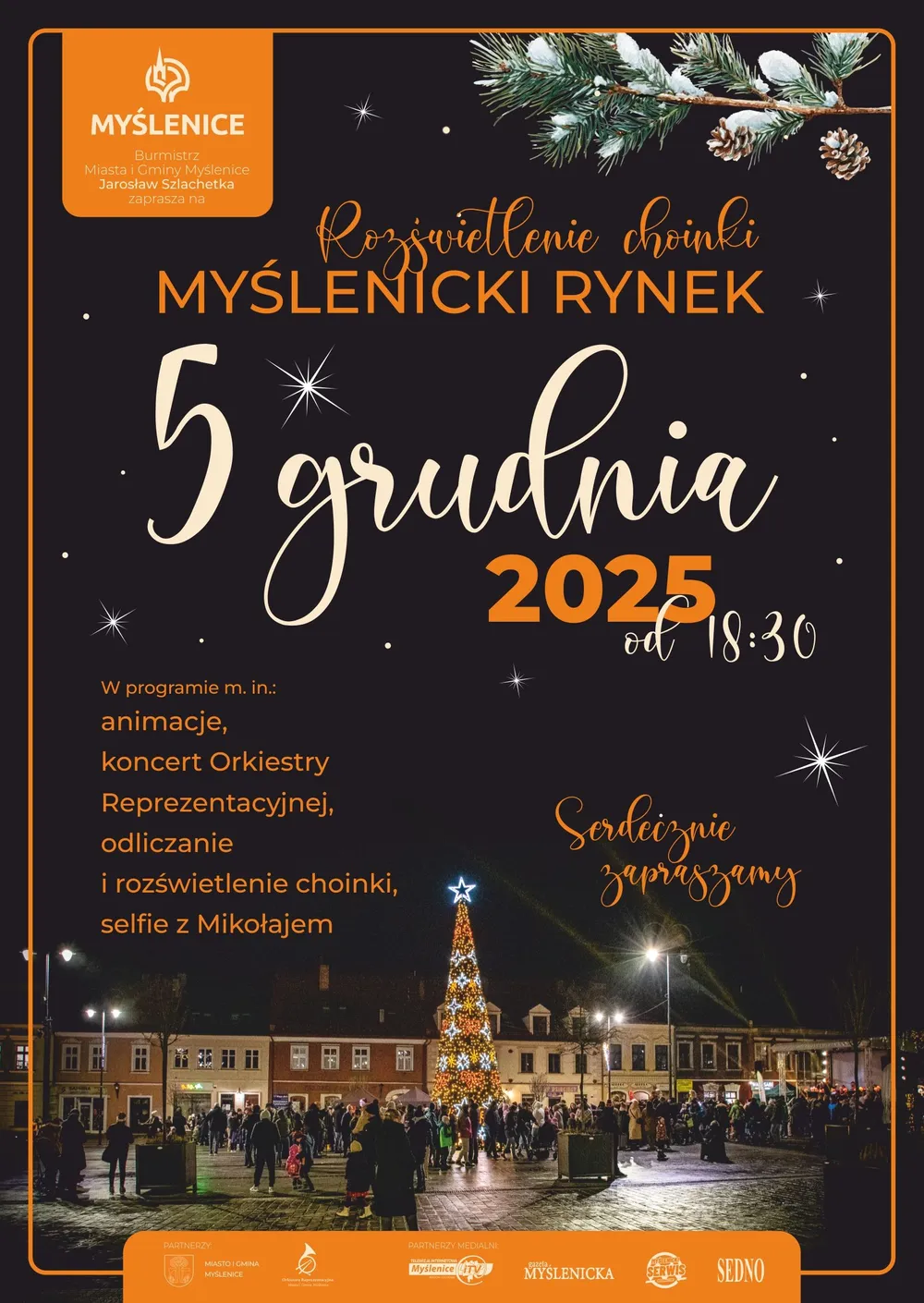 Zbliża się magiczny, świąteczny czas! Burmistrz Miasta i Gminy Myślenice Jarosław Szlachetka serdecznie zaprasza wszystkich mieszkańców oraz gości do wspólnego udziału w grudniowych wydarzeniach organizowanych na terenie gminy.