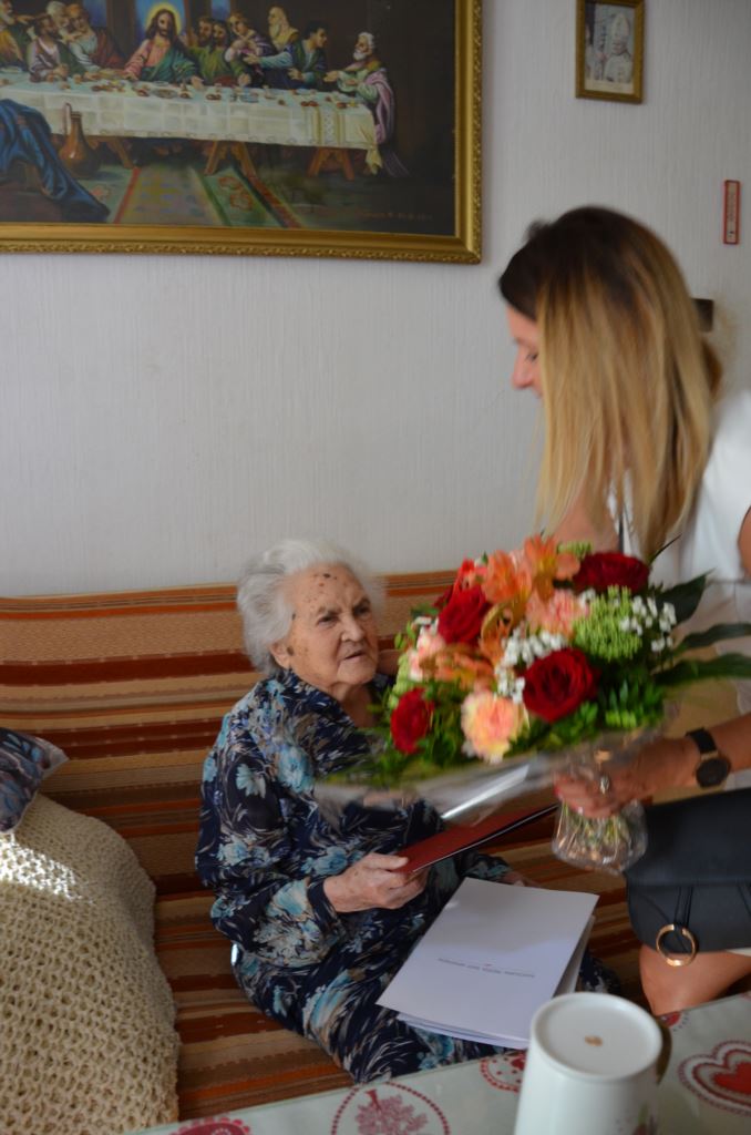 Z tej okazji Burmistrz Nowego Wiśnicza Małgorzata Więckowska oraz Kierownik Urzędu Stanu Cywilnego Sylwia Kura odwiedziły Panią Janinę składając jej życzenia, wręczając kwiaty oraz drobny upominek.