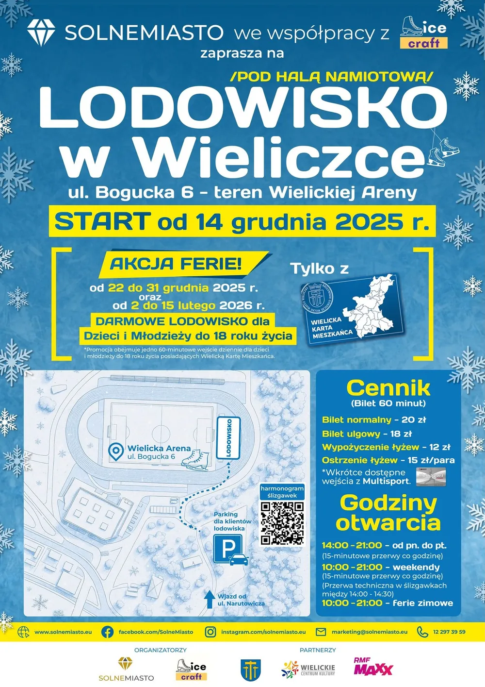 W czasie akcji „FERIE”,od 2 do 15 lutego 2026 r. dzieci i młodzież do 18. roku życia mogą skorzystać z bezpłatnego, 60-minutowego wejścia na lodowisko.