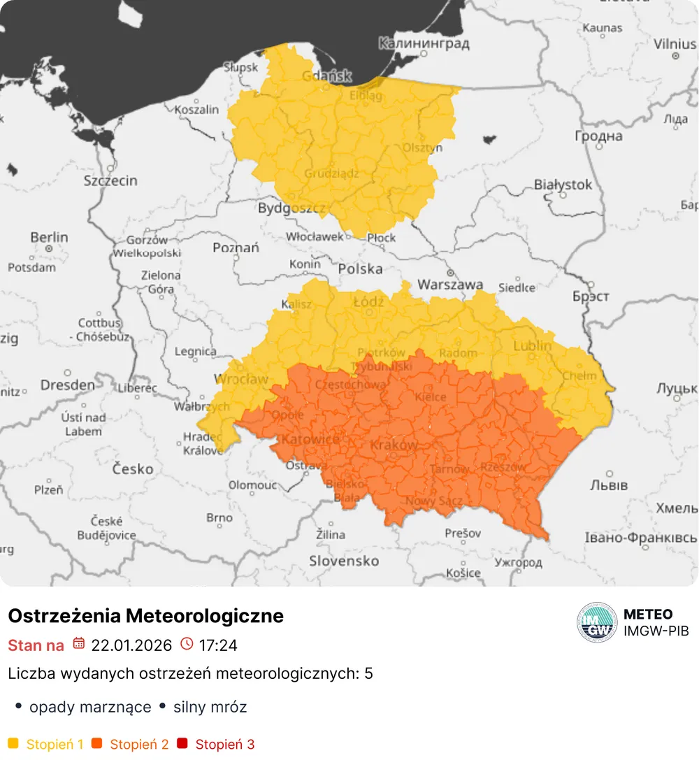 Z prognoz wynika, że w okresie od piątku 23 stycznia (od godz. 15:00) do niedzieli 25 stycznia (do godz. 10:00) mogą występować okresami słabe opady marznącego deszczu i mżawki powodujące gołoledź. Prawdopodobieństwo zjawiska IMGW określa na 80%, co w praktyce oznacza, że ryzyko oblodzenia nawierzchni jest bardzo realne i może pojawiać się falami, zależnie od temperatury i intensywności opadów.
