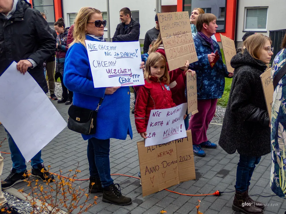 Jedna z głośniejszych manifestacji odbyła się 11 kwietnia 2023 roku na osiedlu Kliny. Kilkadziesiąt osób protestowało przeciwko podwyżkom, wskazując, że w momencie składania wniosków stawki miały być znacząco niższe, a umowy – w ich odczuciu – miały dawać gwarancję braku gwałtownych wzrostów. "Czuję się oszukana. Na tamte warunki było mnie stać, mogłam odłożyć część pieniędzy "na życie". Teraz jestem zmuszona żyć bardzo skromnie, zostaje mi niewiele" – mówiła jedna z mieszkanek. Protestujący podkreślali też, że mieszkania otrzymali bez wyposażenia i wykończenia w standardzie "pod klucz", więc wcześniej włożyli w lokale własne oszczędności, licząc, że systematyczne płatności doprowadzą ich do wykupu. Największy niepokój budził brak konkretów, gdy chodzi o możliwość dojścia do własności. "Mydlenie oczu, odkładanie wszystkiego na czas nieokreślony, traktowanie nas z góry, bez żadnego dialogu" - podsumował jeden z lokatorów.
