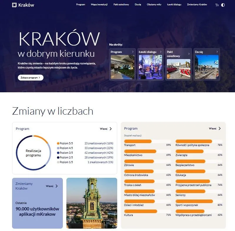Co znajdziemy na wdobrymkierunku.krakow.pl? Przede wszystkim podsumowanie dotychczasowych działań nowego włodarza Krakowa i miejskich instytucji. Na stronie głównej widać dane w liczbach - procent realizacji obietnic wyborczych. Przypomnijmy, Jan Hoffman, pod koniec 2024 roku wygrał z prezydentam Krakowa w Wojewódzkim Sądzie Administracyjnym. Spór dotyczył właśnie realizacji obietnic wyborczych Miszalskiego, które Hoffman próbował ocenić, pytając o podjęte działania. Teraz wszystko ujęte jest w przejrzyste zestawiania i grafiki.