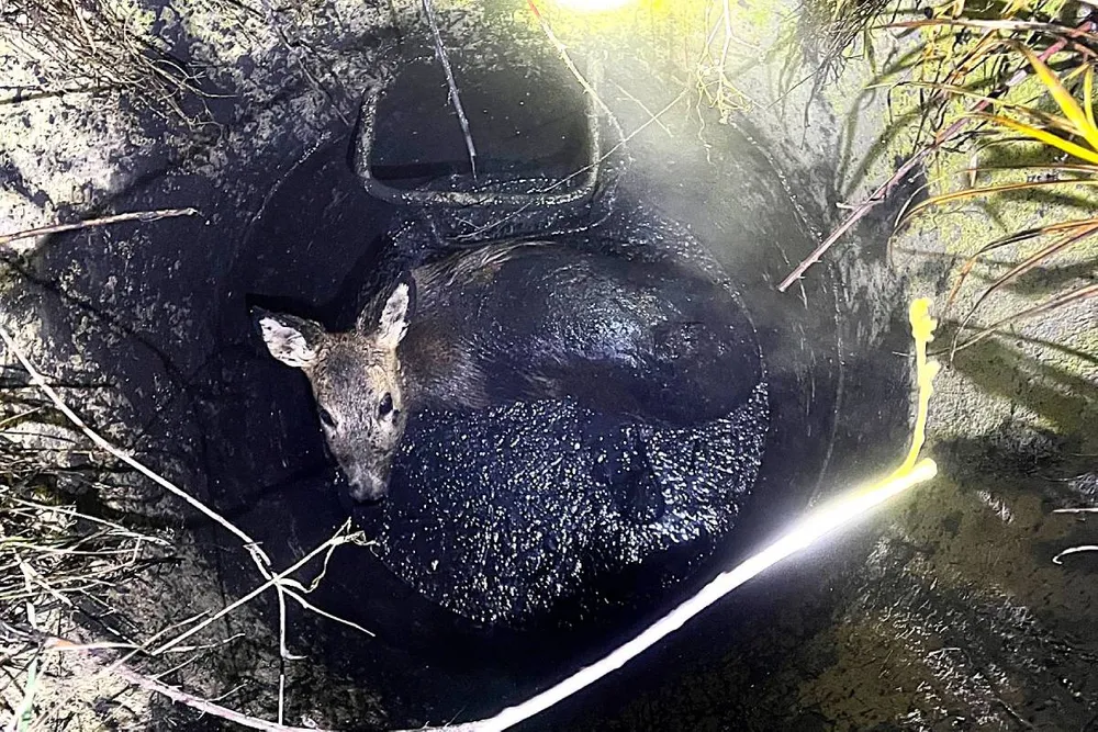 Szybka reakcja straży miejskiej i profesjonalne działanie strażaków pozwoliły uratować młodą sarnę, która wpadła do studzienki kanalizacyjnej w pobliżu torów kolejowych przy ul. Wielkich Pieców w Krakowie.