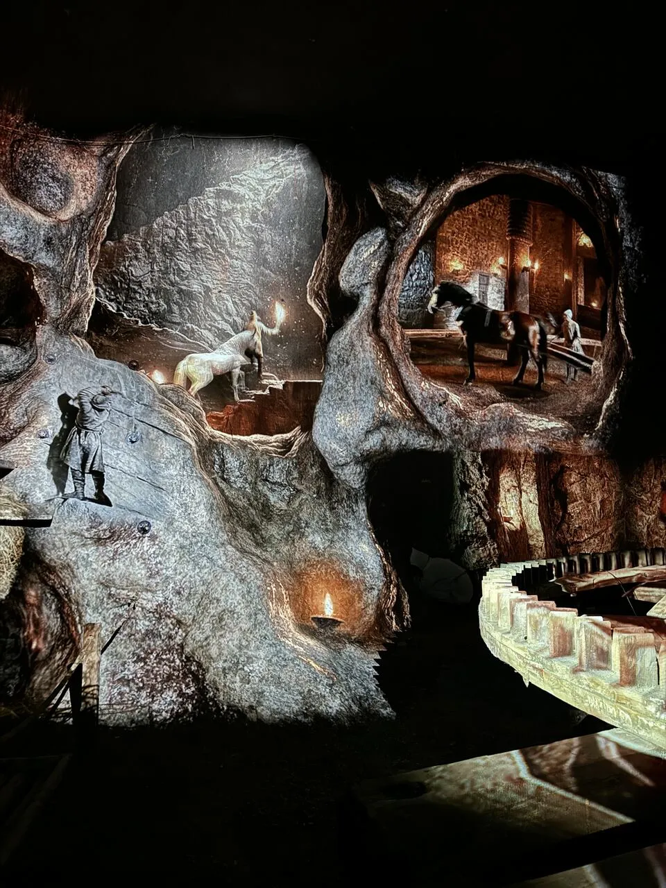 Zwieńczeniem ekspozycji był mapping, który – bazując na archiwalnych rycinach – ukazywał pracę górników i zwierząt pod ziemią. Dzięki temu odwiedzający mogli zobaczyć m.in. moment zaprzęgania koni oraz ich pracę przy napędzaniu urządzeń wyciągowych.