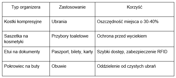 Organizery podróżne wprowadzają porządek w chaosie pakowania. Kostki kompresyjne segregują ubrania według kategorii i jednocześnie oszczędzają miejsce w walizce. Osobne saszetki na elektronikę, kosmetyki i dokumenty ułatwiają szybkie odnalezienie potrzebnych rzeczy. Wodoodporne wersje chronią zawartość przed przypadkowym zalaniem.