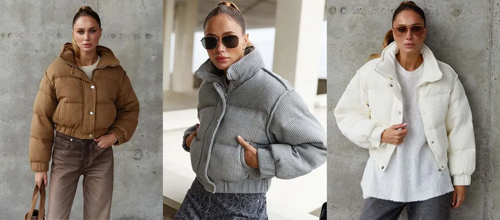 - Jeśli masz szersze biodra, postaw na kurtkę z objętością u góry — oversize bomberkę, puffer z wyraźnym ramieniem lub krótką parkę.
