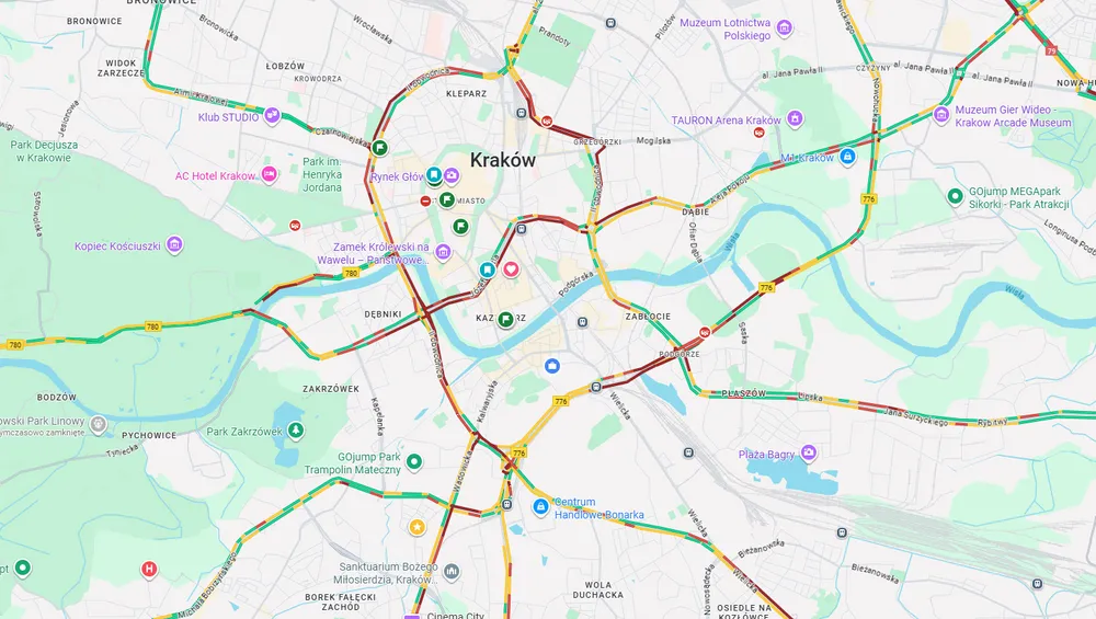 Kraków utknął w korkach. Zrzuty z Map Google pokazują skalę problemu: miasto „płonie” czerwienią i żółcią, a utrudnienia widać nie tylko w centrum, ale też na całej obwodnicy wokół Krakowa. Jednocześnie trudne warunki drogowe dają się we znaki w innych częściach Małopolski – służby informują o problemach z przejazdem i kolizjach.