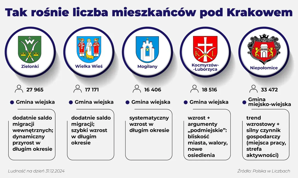 W danych GUS (stan na 31 grudnia 2024 r.) widać wyraźnie, że podkrakowski pierścień ma swoich demograficznych liderów.