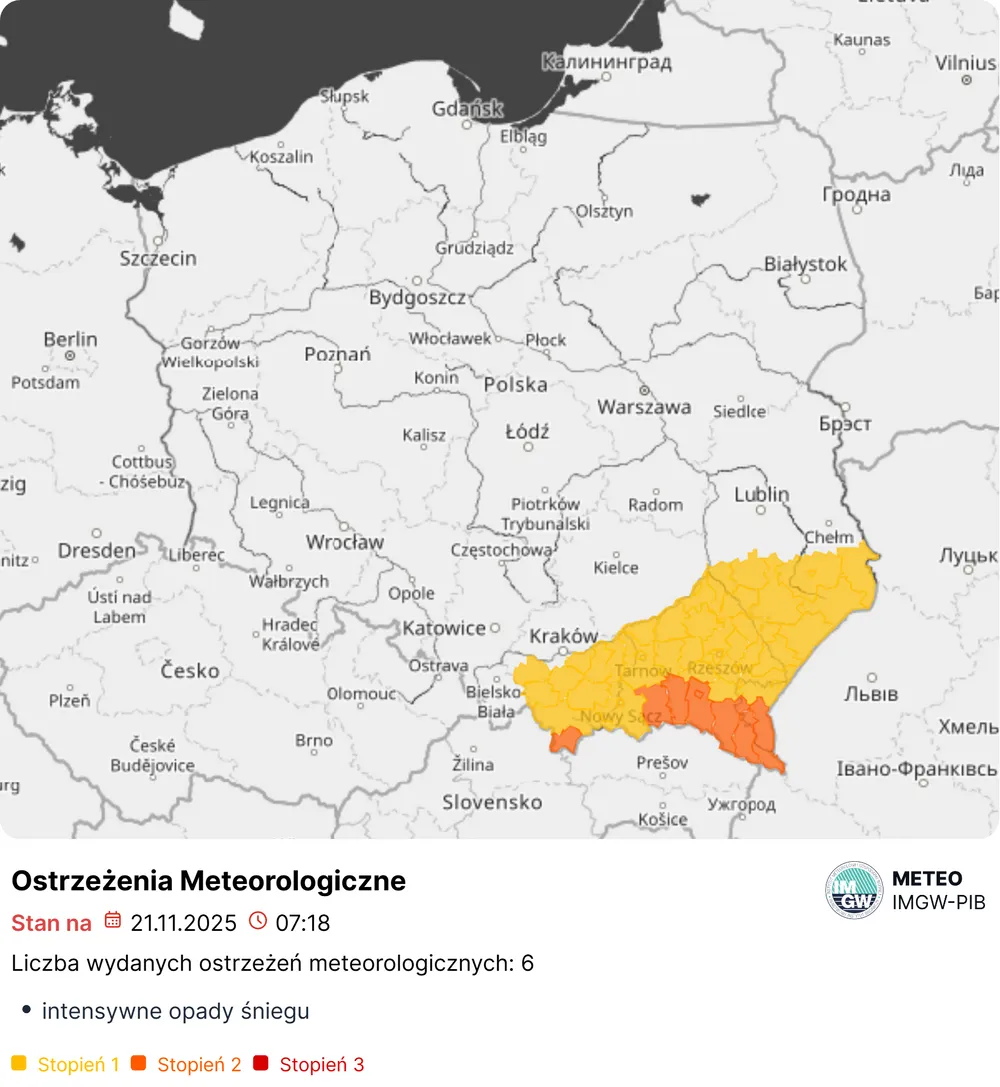 Piątek, 21 listopada w Małopolsce przyniósł zimowy scenariusz: w wielu miejscach sypie, a na południu regionu śnieg może padać intensywnie, ograniczając widzialność nawet do 500 metrów. IMGW zapowiada na nizinach przyrost pokrywy rzędu 10–15 cm (lokalnie), a w rejonach podgórskich i w Tatrach jeszcze więcej — tam obowiązują wyższe stopnie ostrzeżeń. Rano i wieczorem będzie ślisko: przydadzą się buty z protektorem i kurtka z kapturem, a nawet parasol; kierowcy bez opon zimowych powinni dziś wybrać komunikację miejską, a mający „zimówki” — doliczyć kilka minut na skrobanie szyb i wolniejszą jazdę.