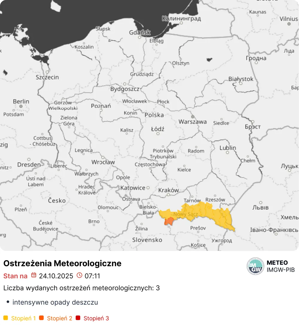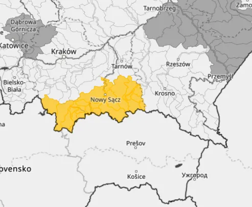 Intensywny deszcz – powiaty nowosądecki, gorlicki i nowotarski - gdzoie już pada (1 stopień), Tatry i powiat tatrzański - intensywny deszcz (2. stopień): ważne do 18:00; suma opadów duża, miejscami znaczna (do 35 mm, lokalnie może wynieść w Tatrach do około 70 mm, na pozostałym obszarze powiatu tatrzańskiego do około 35 mm).