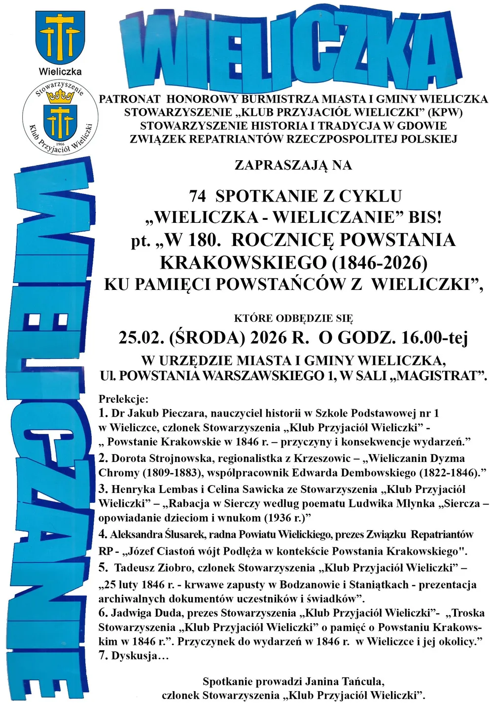 Prezes KPW zaprosiła zebranych na 74. spotkanie z cyklu „Wieliczka–Wieliczanie” Bis!, które odbędzie się 25 lutego o godzinie 16.00 w sali „Magistrat” i będzie poświęcone 180. rocznicy Powstania Krakowskiego. Przedstawiono również harmonogram uroczystości rocznicowych w Wieliczce, Gdowie oraz Krakowie-Podgórzu. Spotkanie zakończyło się wspólną fotografią uczestników.