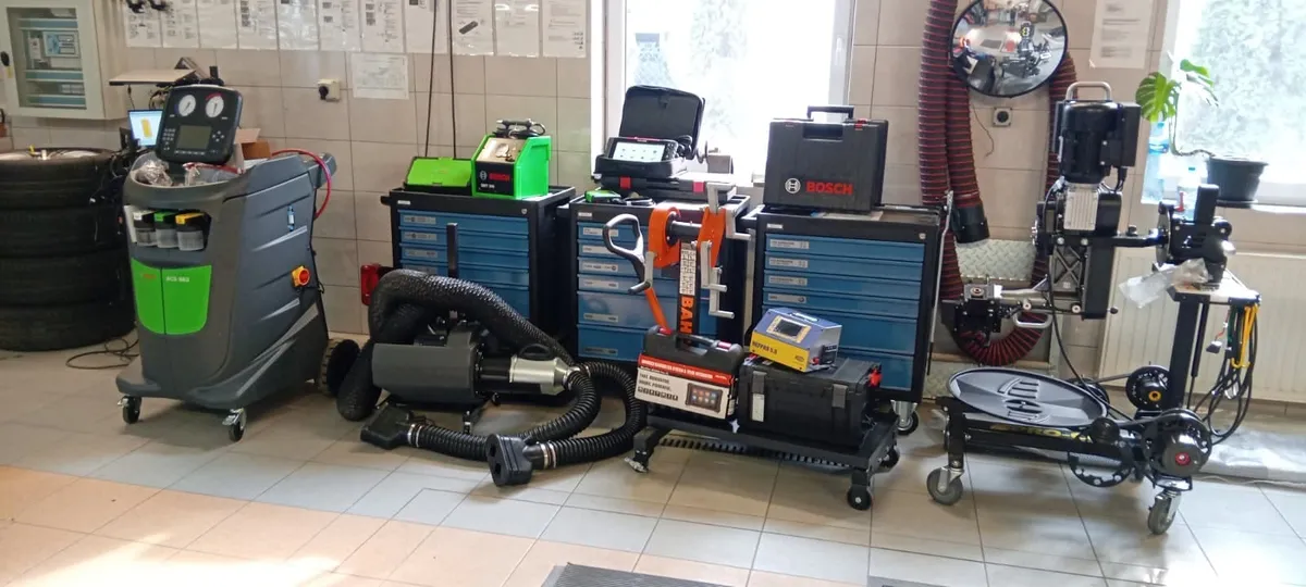 Równolegle doposażono warsztaty mechaniczne. Uczniowie pracują na testerach diagnostycznych, urządzeniach do obsługi klimatyzacji, przetłaczarce do tarcz hamulcowych, zestawach blokad rozrządów oraz nowoczesnych stanowiskach narzędziowych. To wyposażenie pozwala prowadzić zajęcia w warunkach zbliżonych do tych, które funkcjonują w profesjonalnych serwisach.