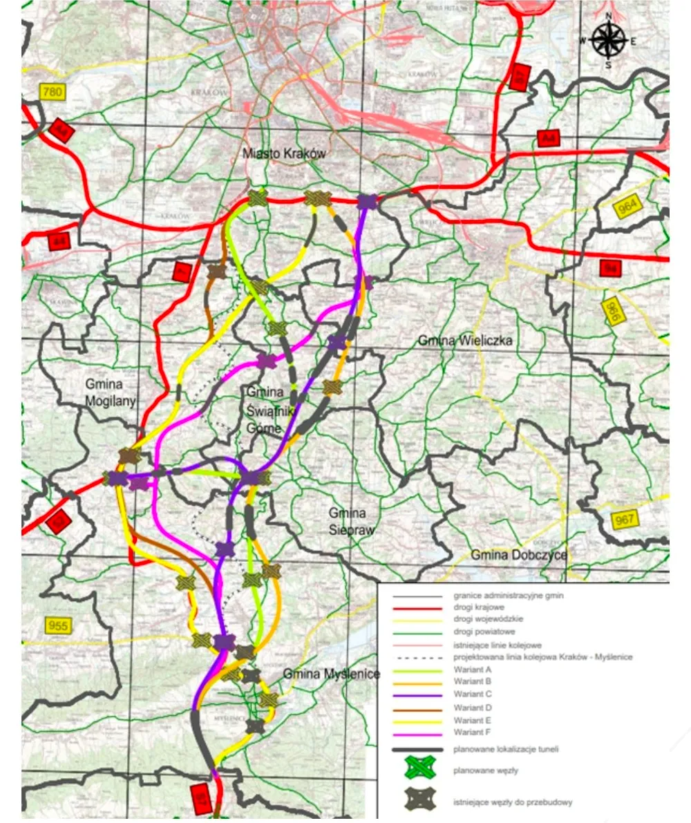 GDDKiA potwierdziła, że do dalszych prac wytypowano sześć korytarzy. Wszystkie zaczynają się na autostradzie A4 – w rejonie węzłów Kraków Łagiewniki, Kraków Wieliczka, projektowanego węzła Kraków Tuchowska albo Kraków Bieżanów – i wszystkie kończą się w jednym miejscu: na istniejącej już drodze ekspresowej S7 za Myślenicami. Różnią się długością, liczbą tuneli i gminami, przez które przechodzą.