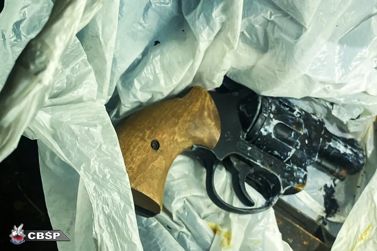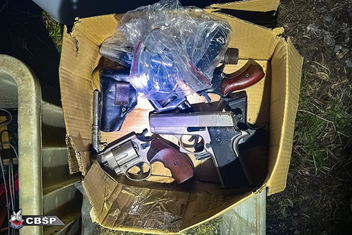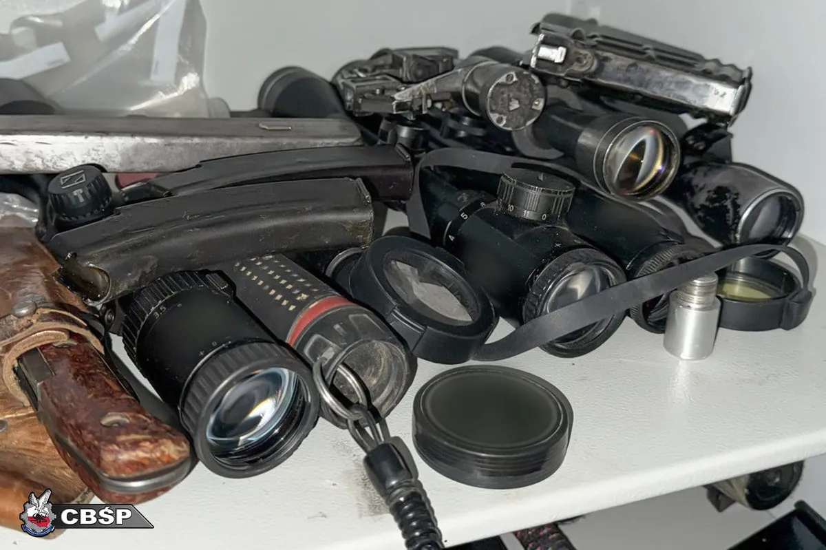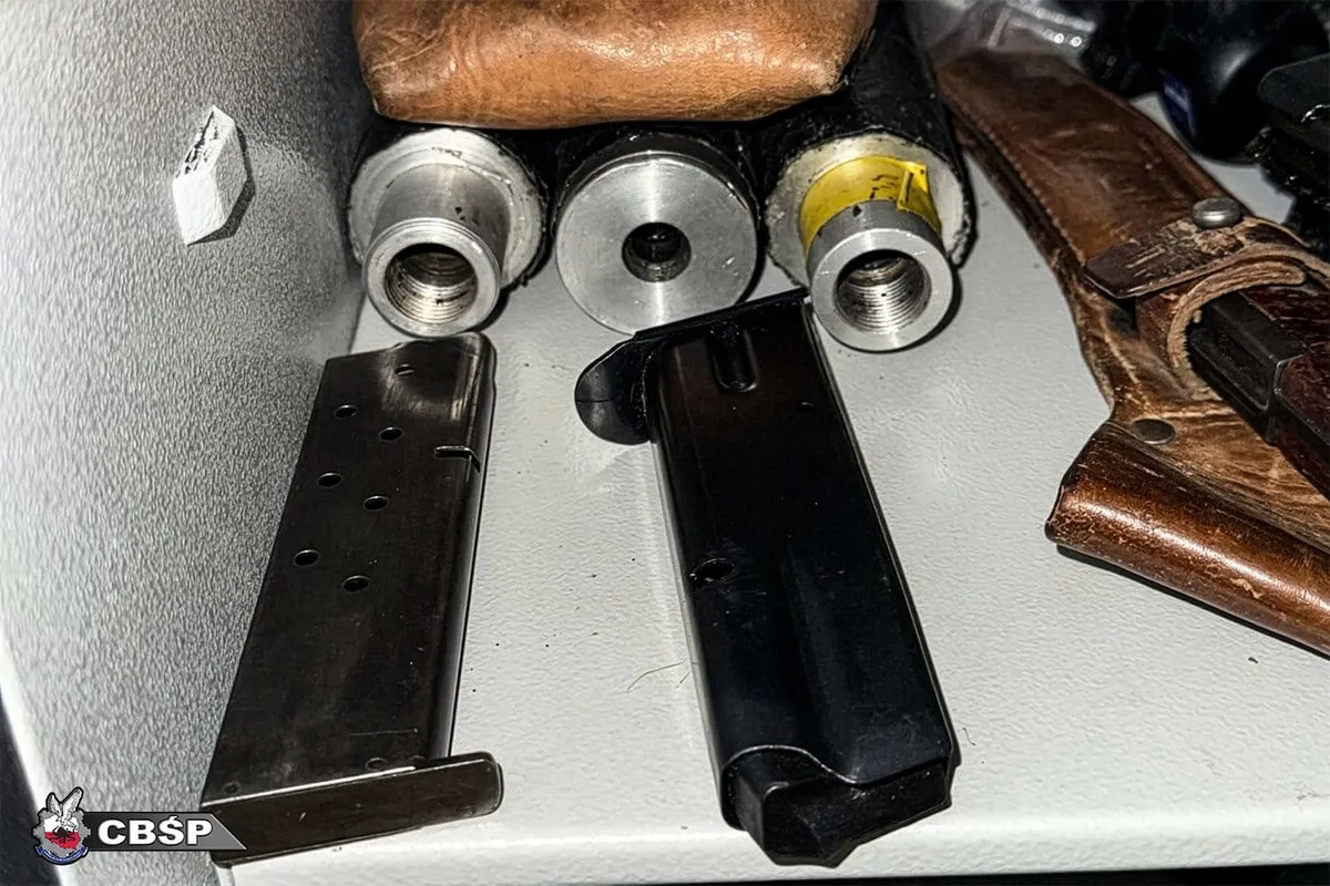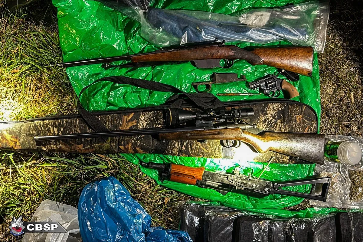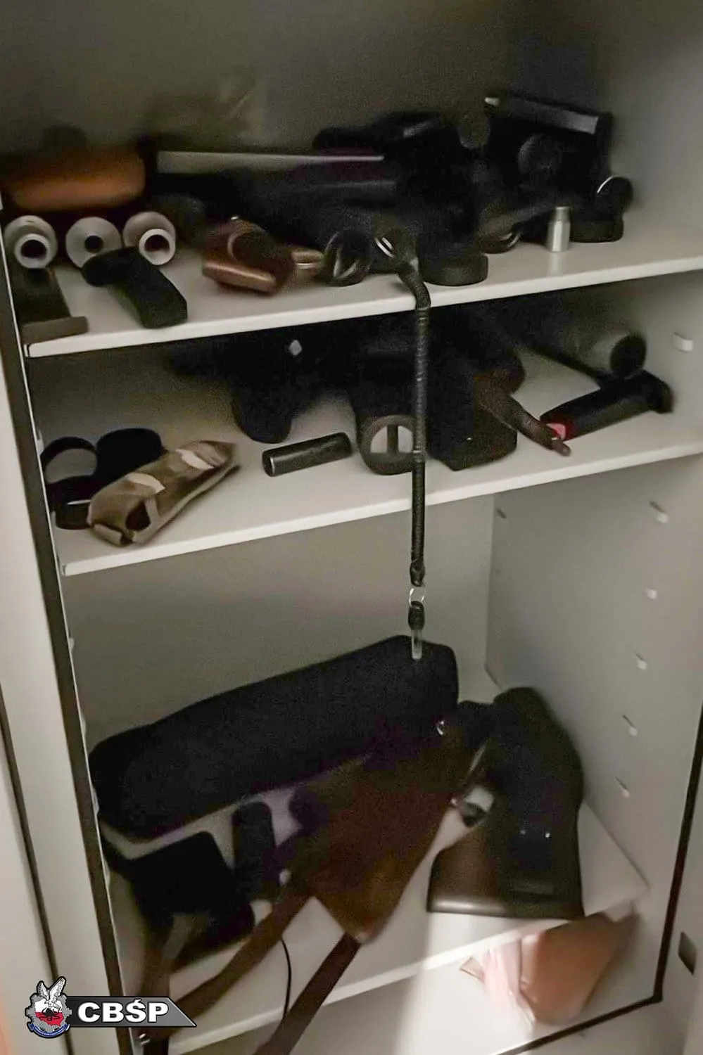 W jednej z szafek funkcjonariusze natrafili na prawdziwy arsenał: kilkanaście sztuk broni palnej, zarówno długiej, jak i krótkiej, a także amunicja i elementy składowe różnych rodzajów broni. Wśród zabezpieczonych rzeczy były też lornetki, noże myśliwskie, pokrowce na broń, kamizelki z wkładami balistycznymi oraz inne wyposażenie o charakterze taktycznym. Były tam także przedmioty kwalifikowane jako broń biała.