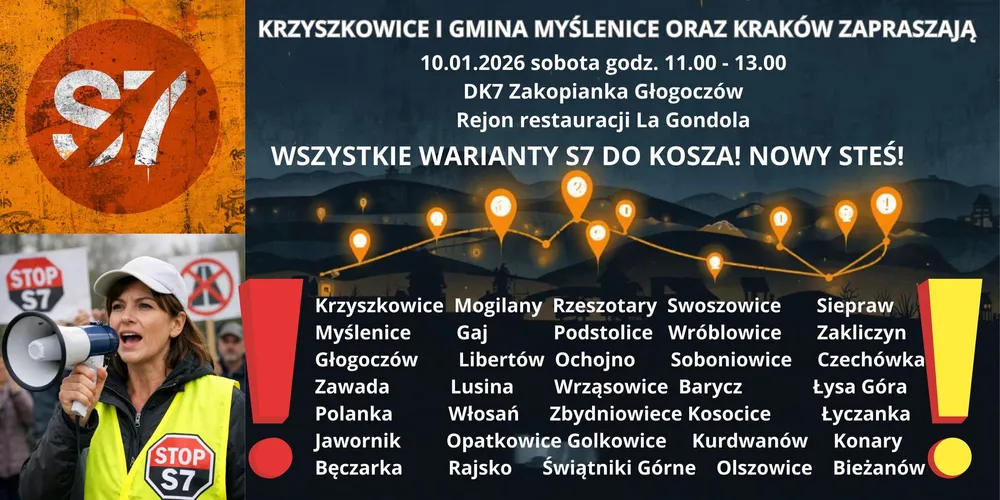 W sobotę 10 stycznia Zakopianka w rejonie Głogoczowa znów stanie się miejscem protestu przeciwko planom nowego odcinka S7 Kraków–Myślenice. Dla kierowców oznacza to realne utrudnienia i konieczność korzystania z objazdów. Dla mieszkańców okolicznych miejscowości – kolejną próbę pokazania, że sprawa nie dotyczy „jakiejś kreski na mapie”, tylko domów, pól, dojazdów i poczucia bezpieczeństwa.