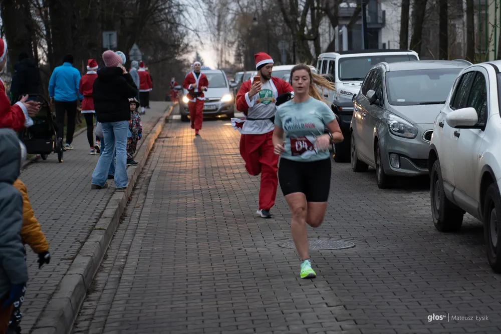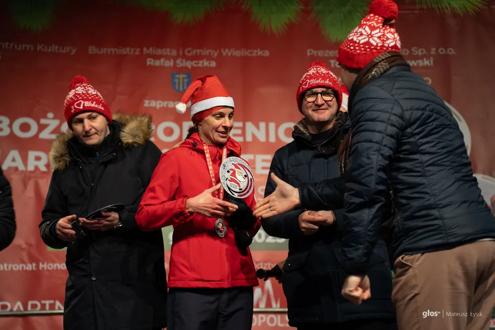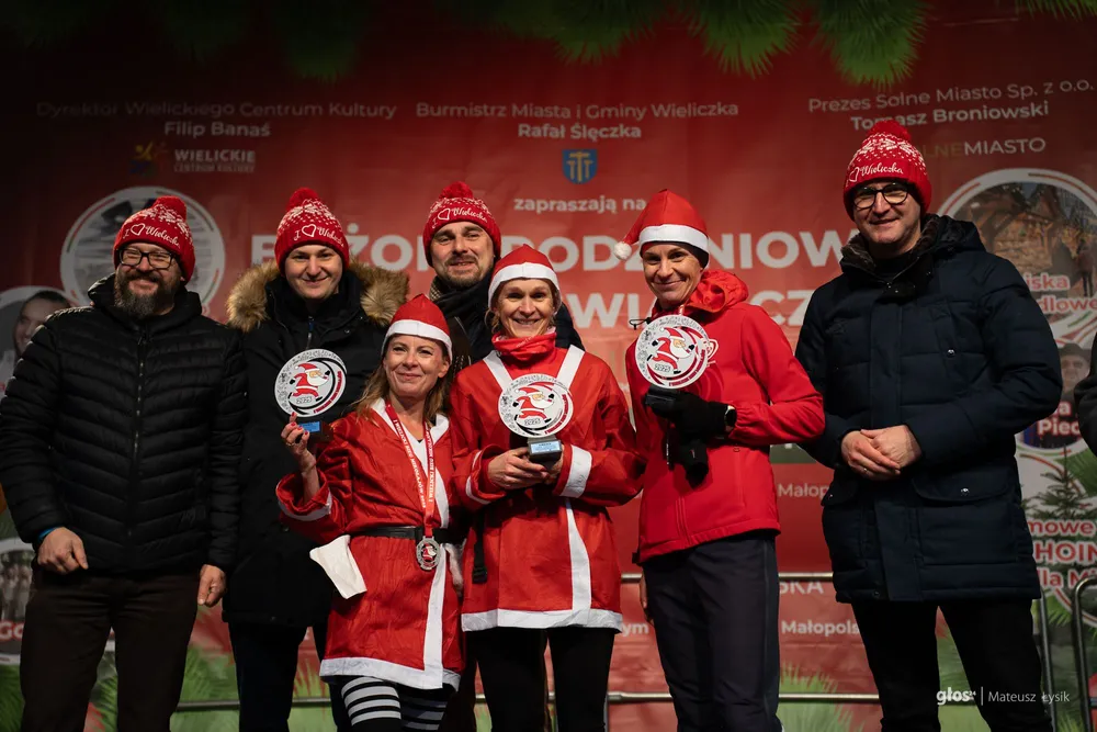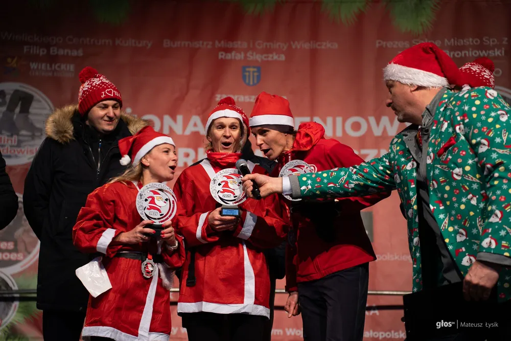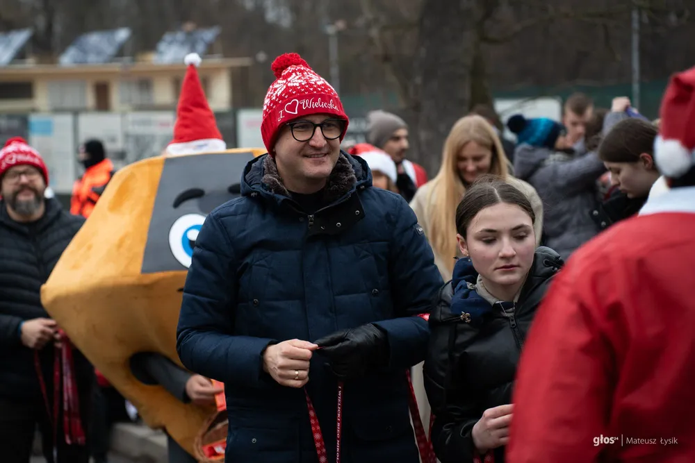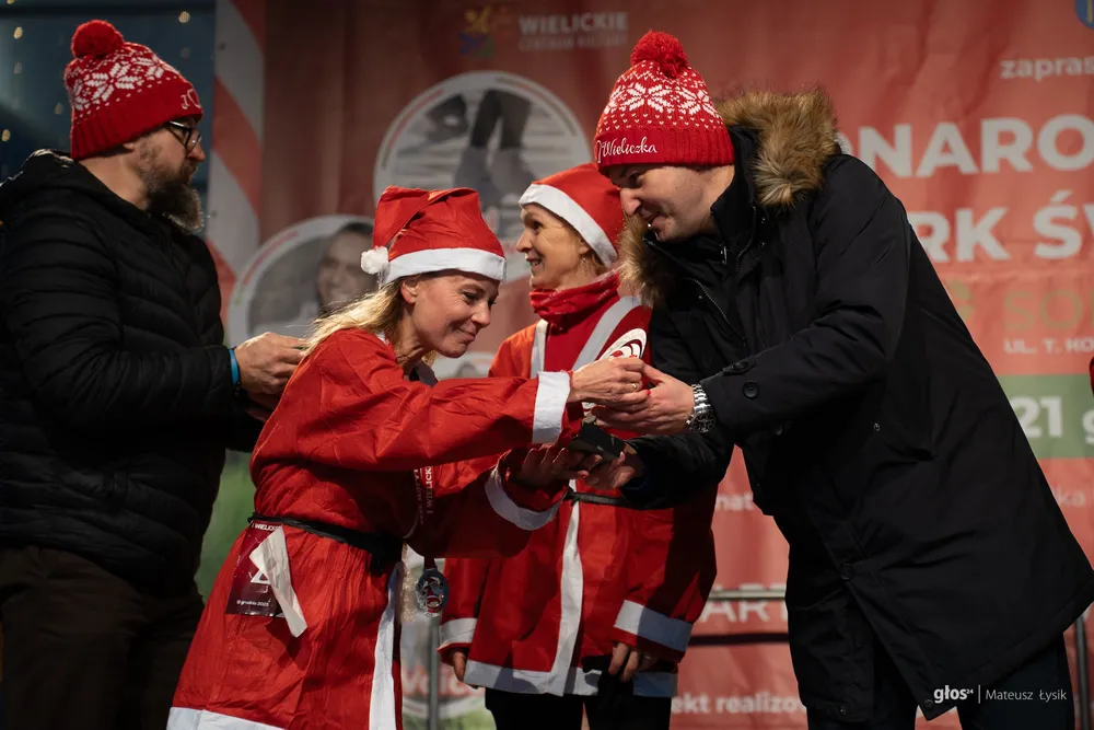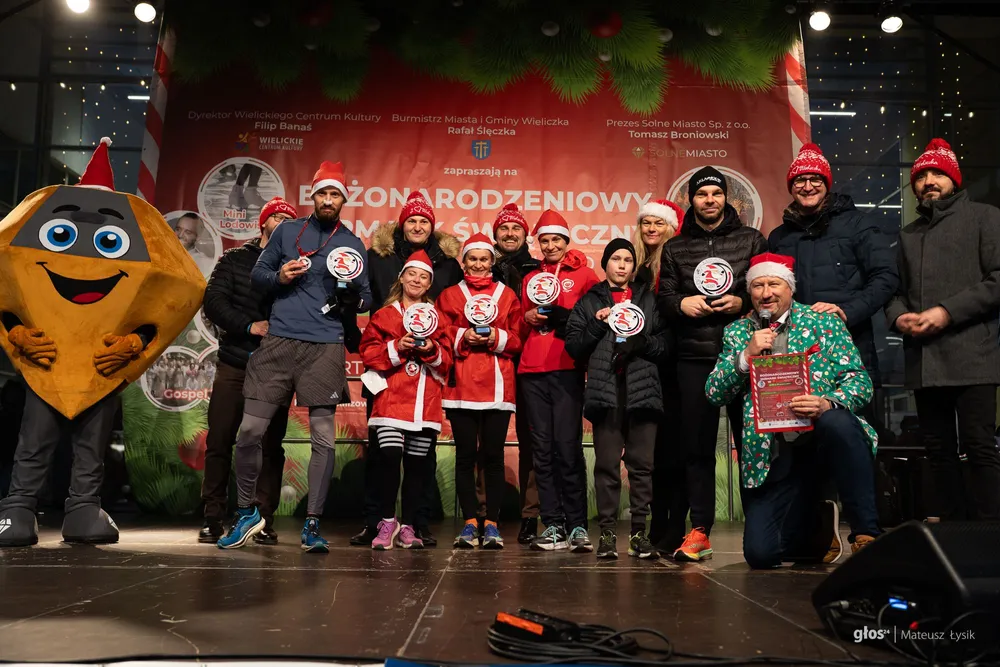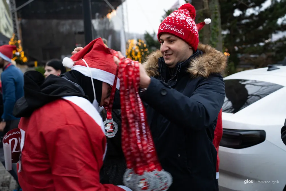 Dużo emocji przyniosła też sportowa nowość. O 15:00 wystartował I Wielicki Bieg Mikołajów – pierwsze takie wydarzenie w historii miasta. Trasa liczyła 5 kilometrów i z wielickiego Rynku poprowadziła ulicami i alejkami parku do mety, którą umieszczono przy Solnym Mieście, w samym sercu jarmarku. W praktyce wyglądało to tak, jak miało wyglądać: radosna, „czerwona fala” uczestników i widok, który od razu podpowiada, że to ma potencjał na nową lokalną tradycję.