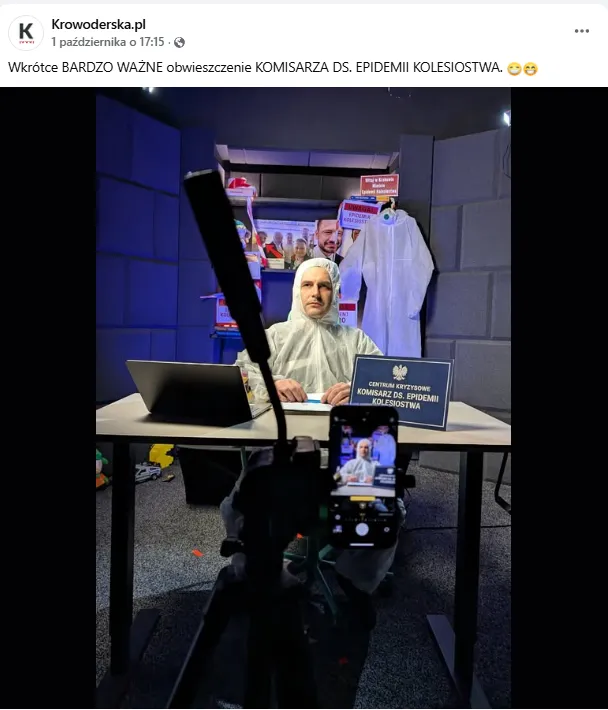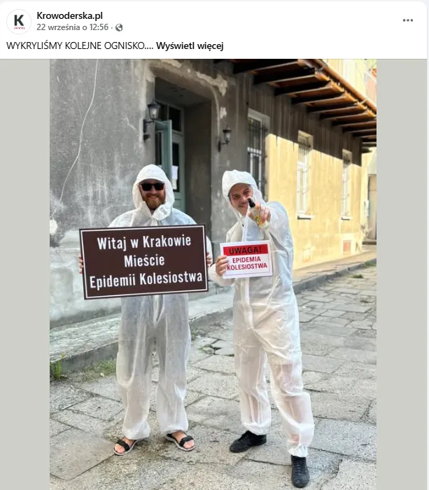Mieszkańcy Krakowa mogli ostatnio zobaczyć pod magistratem sceny jak z filmu: ludzie w białych kombinezonach, maseczkach i rękawicach pojawili się, by – jak mówią – badać „ogniska kolesiostwa”. Happening miał miejsce pod urzędem, a jego uczestnicy nagrywali relacje do sieci. W tym samym czasie na tablicach z nazwą miasta przy wjazdach do Krakowa zawisły satyryczne ostrzeżenia o rzekomej „epidemii kolesiostwa”, stylizowane na znaki drogowe. To właśnie od tych mocnych, wizualnych gestów zaczęto mówić o „epidemii kolesiostwa”.