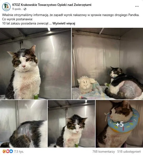 Krakowskie Towarzystwo Opieki nad Zwierzętami przekazało, że w sprawie byłego właściciela Pandka zapadł wyrok nakazowy. Sąd orzekł: 10 lat zakazu posiadania zwierząt, 20 tys. zł grzywny, 10 tys. zł nawiązki na rzecz KTOZ oraz przepadek kota. To rozstrzygnięcie nie jest prawomocne. KTOZ zapowiada złożenie sprzeciwu.