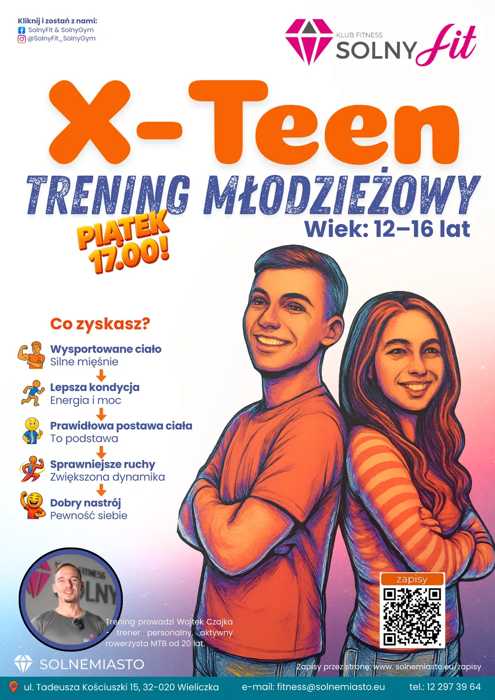 Solne Miasto zaprasza nastolatków w wieku 12–16 lat na nowoczesne zajęcia ruchowe X-Teen, stworzone z myślą o młodych osobach w okresie dorastania. Program łączy trening fizyczny z zabawą i motywującą atmosferą, wspierając prawidłowy rozwój i kondycję uczestników.